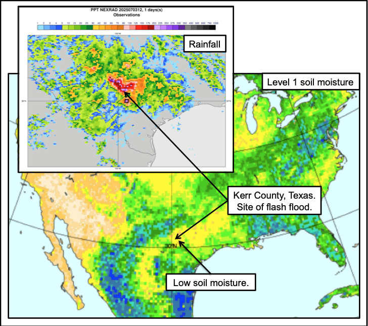 Fig2.1.4.5-9: Example of rapid runoff from heavy rainfall despite very low soil moisture in level1 in IFS at this time.  Kerr county is a hilly region prone to flash floods but in this case the dry soil moisture might be expected to absorb at least some precipitation.  Nevertheless, there was flash flooding. The river level went from about 9 feet to 29 feet in the space of 90 minutes.   There was a large loss of life.  Users should not underestimate the potential for rapid runoff despite low soil moisture.