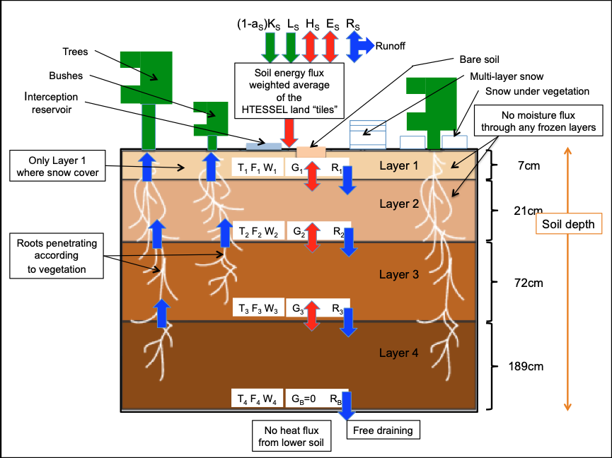 The IFS multi-layer soil model uses four layers to represent the top ~1.3m of soil and the complex heat fluxes and interactions between them.   These are sufficient to represent correctly all timescales from one day to one year.  The soil model represents the vertical structure of the soil and the evolution of soil temperature and liquid water content in each layer.  The heat and moisture energy flux is represented by the model: