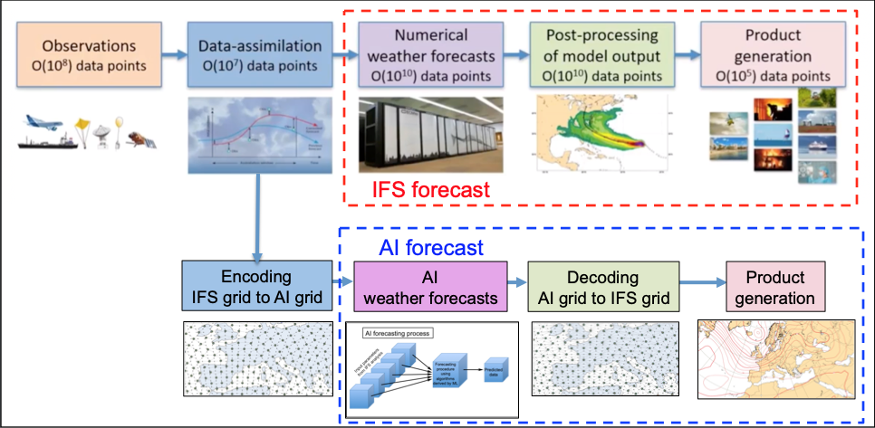 Fig2.2-2: Comparing IFS and AI forecasting suites and the flow and approximate size of data for each.