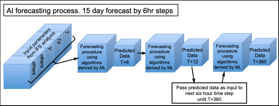 Essentially, at each grid point the AI forecasting process applies algorithms to forecast each variable. These algorithms relate input data to forecast data and have been derived by machine learning (ML) training. The forecasting process uses the complete set of available observed variables and produces a complete set of forecast variables for six hours later. Two AI forecast systems are used at ECMWF: