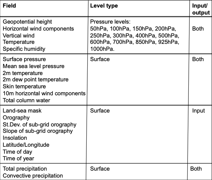 The aim of Machine Learning (ML) is to develop (or train) an empirical model directly from observations or reanalyses. Observations implicitly contain the physics of the atmosphere but it is not necessary for ML models emulate the underpinning physics that dictates the evolution of variables through a forecast. During the ML training process, ML considers all the set of observed or initial data, and using statistical methods relates these to observed variable (e.g.temperature) six hours later at each point. The initial data and corresponding data at the end of the forecast period have been extracted from some 20 years of ERA5 data. At ECMWF, machine learning training is aimed towards producing six hour forecasts. Table2.2.1 gives the set of observed and forecast variables and the constants considered during the machine learning process at ECMWF.