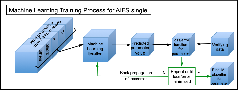 At each grid point a set of reanalysed data is processed using random weighting functions for each parameter. The forecast results are then compared with verifying data. The Root Mean Square (RMS) error metric (loss function) RMS is then evaluated. The RMS influences what is fed back to the ML processor (back propagation). This induces modification of the weighting functions for each parameter and the resulting forecasts are compared with the verifying data giving new RMS values. This process is repeated many times with the aim to progressively minimise the error metric (RMS). When this minimisation is reached the set of weights for each parameter forms the algorithm for the ensemble forecasting process (See Fig2.2.3-1).