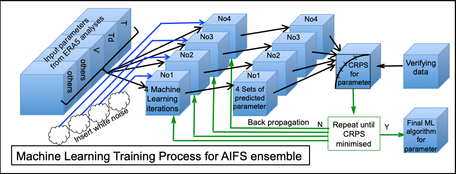A small ensemble group (ECMWF uses a group of 4) is used that give information on the variability of these independent results and to introduce a measure of model uncertainty. At each grid point the set of observed data is processed using four different sets of random weighting functions for each parameter. The four forecast results are then compared with verifying data. The error metric (loss function) is the "almost fair CRPS" which measures how good forecasts are. CRPS is evaluated for the results of the four forecasts. The CRPS influences what is fed back to the ML processors (back propagation). This induces modification of the weighting functions for each parameter and the resulting forecasts are compared with the verifying data giving new CRPS values. This process is repeated many times with the aim to progressively minimise the error metric (CRPS). When this minimisation is reached the set of weights for each parameter forms the algorithm for the ensemble forecasting process (See Fig2.2.4-1). Using CRPS as a loss function accounts for the limitations of using a finite number of ensemble members and ensures an accurate and well-calibrated distribution. Model uncertainty is incorporated as a learnt aspect due to the insertion of white noise.