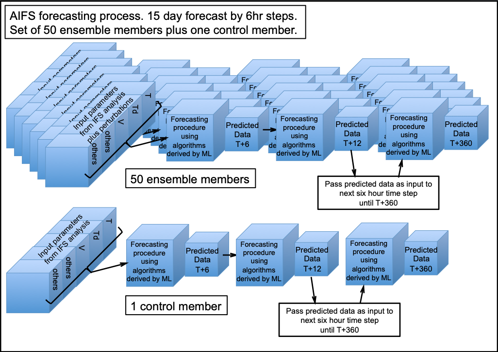 Currently the AI procedures use grid points at a lower resolution about 0.25 of a degree (~25km). The IFS analysed data is "encoded" to values at the AI grid point. These data are then fed to the AI procedure that uses the algorithms derived by the ML trained by minimising CRPS. The algorithm is not complicated and consequently has fast execution allowing a complete global forecast to be made much faster than IFS and other physics-based models. Forecasts are made in six hour time steps and output from each time step is used as the input for the next step. Currently the AI forecasts use 60 repeated six hour time steps to extend the forecast to T+360. Intermediate forecast data is only available at the simulated six hour time steps. Currently no information is available at smaller intervals than six hours.