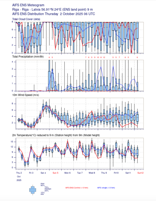 Fig2.2.4-3: An example of an AIFS ENS meteogram for Riga DT06UTC 02 Oct 2025. The plots are in standard box and whisker form. The AIFS ENS control (Red) and AIFS Single (Blue) are shown as continuous lines. Note AIFS single departs largely outside the AIFS ENS box and whisker in places (e.g. precipitation). This may be due to the difference in the ML derivation of the algorithms for AIFS single and AIFS ENS.