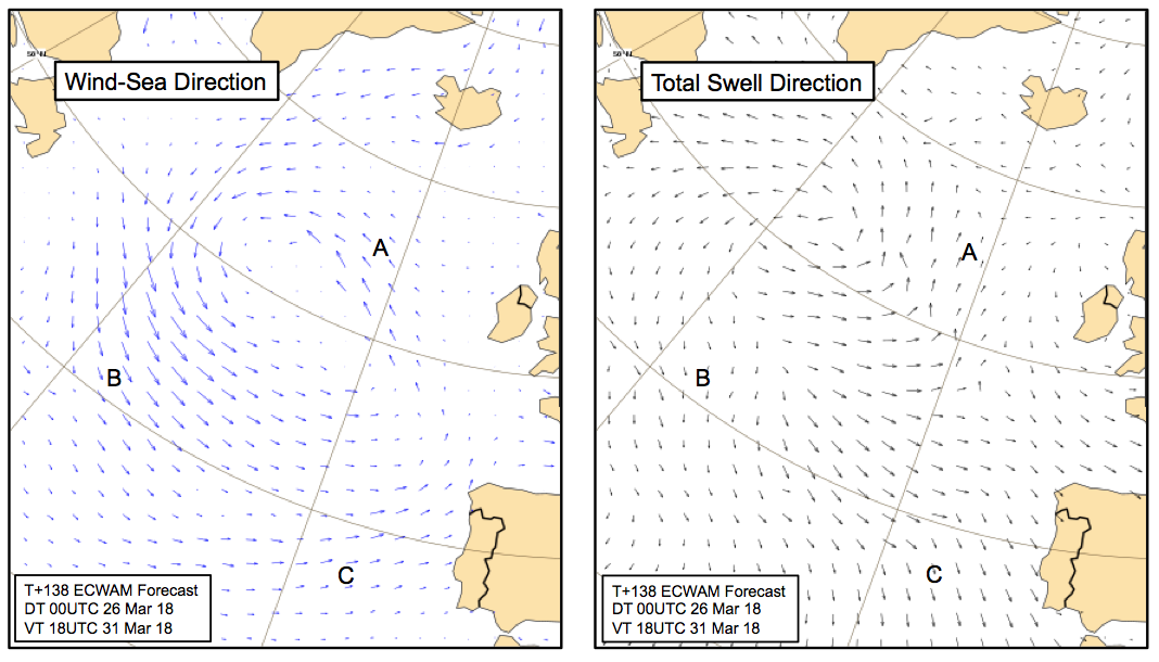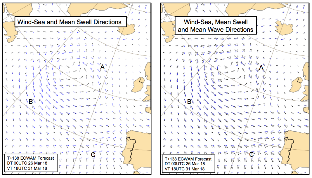 Use of the mean wave height and direction is the simplest method of describing the forecast wave regime in a given area and it is easy to be beguiled into just using this output for forecasts to customers. However, the mean wave direction and height is made up of contributions from wind-sea and swell with different wave periods and they interact in a complex manner. It is important to investigate the forecast wind-sea and swell separately to give an understanding of likely sea conditions in an area (e.g. for a ship requiring a particularly smooth passage) or at a location (e.g. an oil rig).