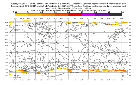 Fig2.3.2-9: Significant height of combined wind waves and swell (Hs). The coloured areas show the difference between the heights derived from the 2d spectra (used where >30% sea ice cover is forecast) and from the wave model (as if open sea). Some large differences are evident, illustrating the need to treat the values of wave height with caution where sea ice is present.
