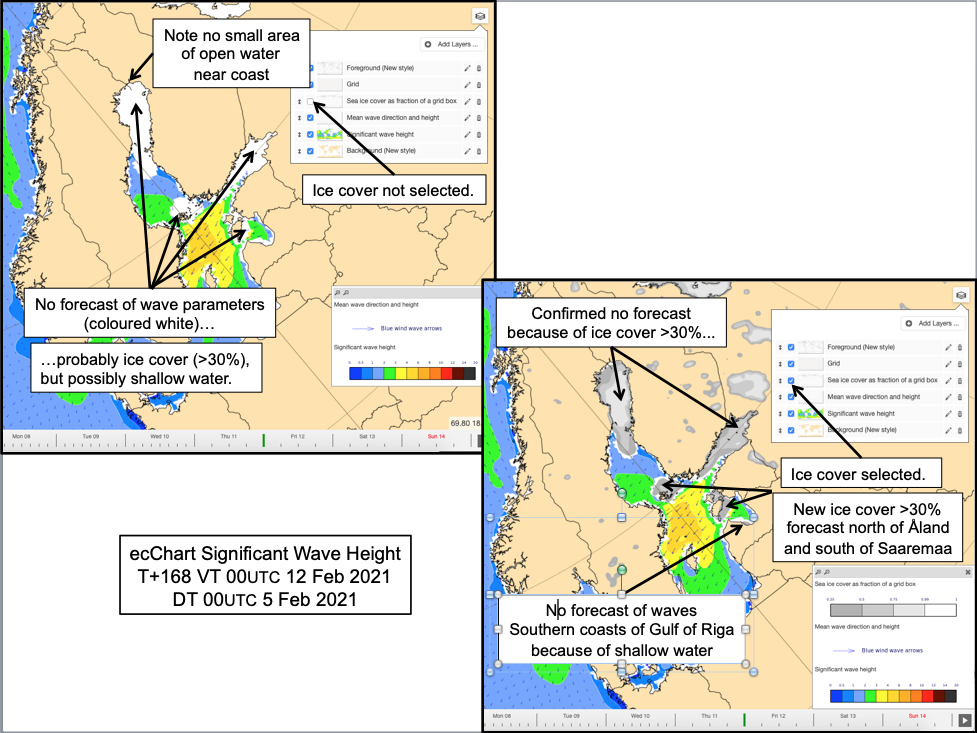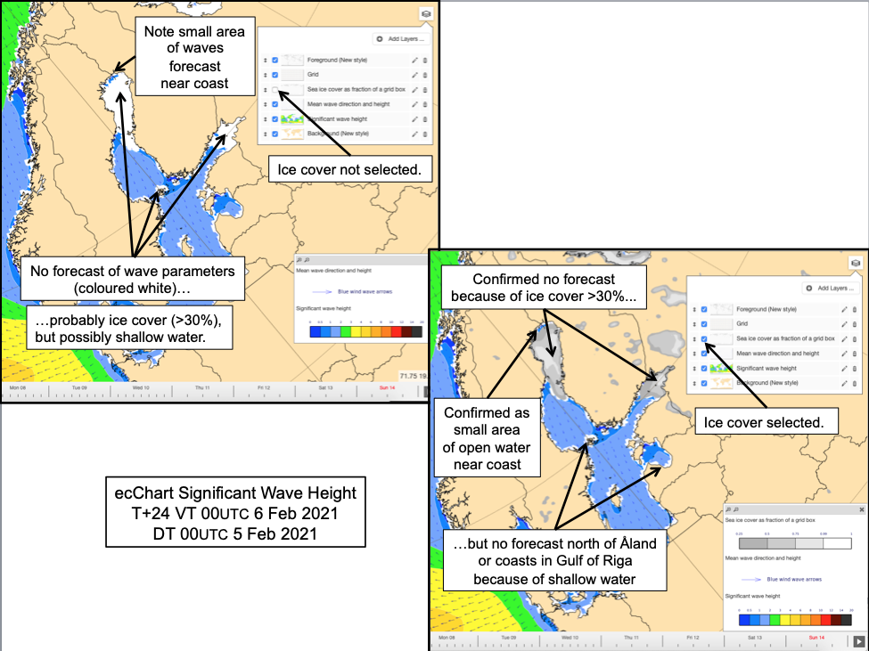 Fig2.3.2-8: Illustration of the importance of distinguishing between ice cover and shallow water when an area of wave parameters is missing.