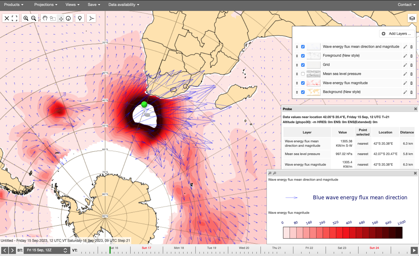 Fig2.3.2-2: Wave energy forecast VT 09UTC 16 Sep 2023, DT 12UTC 15 Sep 2023. The chart shows extreme wave energy flux (~1300KW/m) being driven towards the exposed southern coast of South Africa.