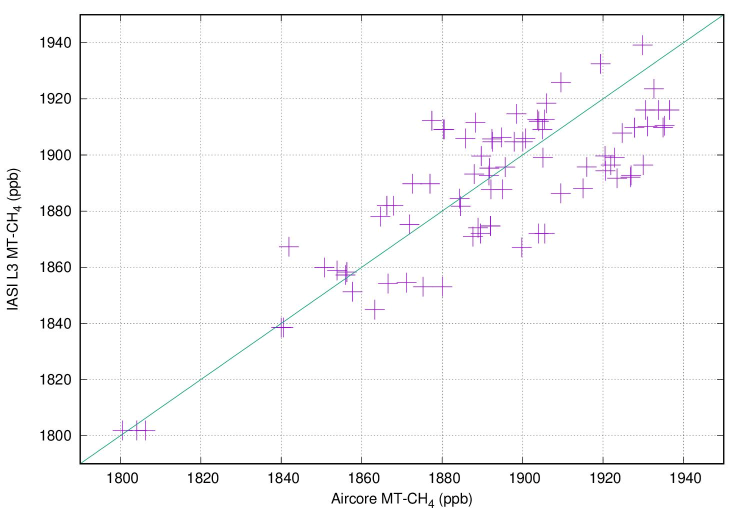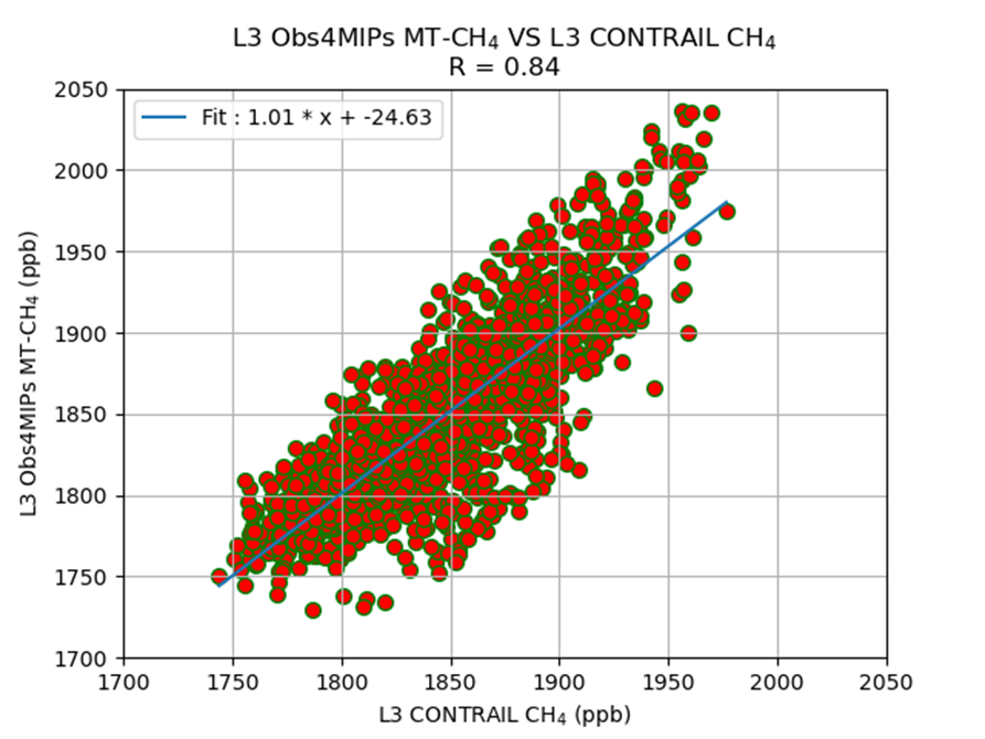 L3 Obs4MIPs MT-CH4 are compared with measurements made in the framework of the CONTRAIL project (Machida et al., 2007, 2008; Matsueda et al., 2008; Sawa et al., 2015). All L3 Obs4MIPs MT-CH4 falling in a 5°x5° grid cell centered on each L3 CONTRAIL measurement are averaged. The larger difference between the partial column retrieved from IASI and the in-situ concentration measured at 10-12 km by CONTRAIL is due to a larger vertical variability for CH4 than for CO2, hence, the comparison between satellite weighted columns and aircraft point measurements is expected to be less satisfactory for CH4. Figure 6 shows the scatter plot of each pair of CONTRAIL / L3 Obs4MIPs MT-CH4.