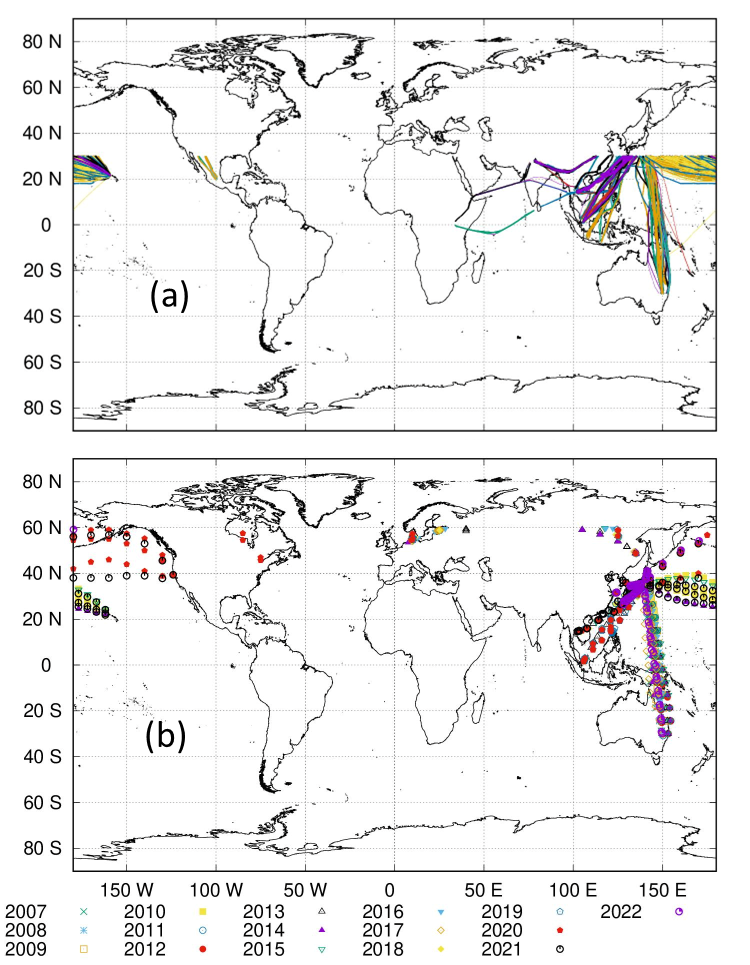 Figure 3: Trajectories of CONTRAIL measurement of CO2 (a) and CH4 (b) above 9 km and per year between 2007 and 2022