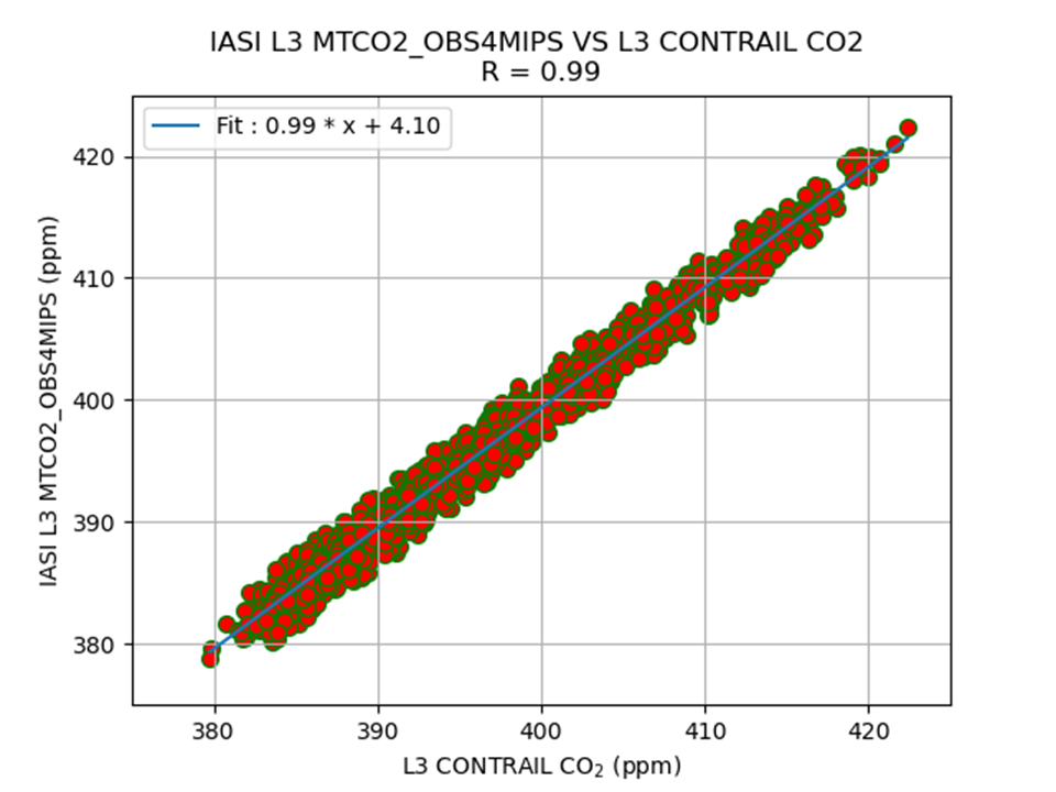 Figure 4 shows comparison of IASI L3 MT-CO2 with L3 CONTRAIL aircraft data as monthly means in 12 latitudinal bands of 5° each. Figure 5 shows the scatter plot of IASI L3 MTCO2 vs. L3 CONTRAIL CO2 for the whole period. The R correlation coefficient is 0.99, the bias and the standard deviation of the difference between them being 0.60 ± 1.25 ppm.