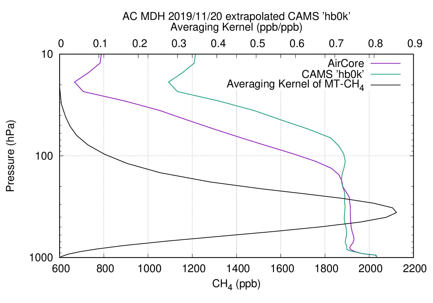 Figure 1: An example of a methane profile (purple line) extrapolated with CAMS 'hb0k' (green line), from AirCore launched at Reims, France and the typical averanging kernel of MT-CH4 (black line).