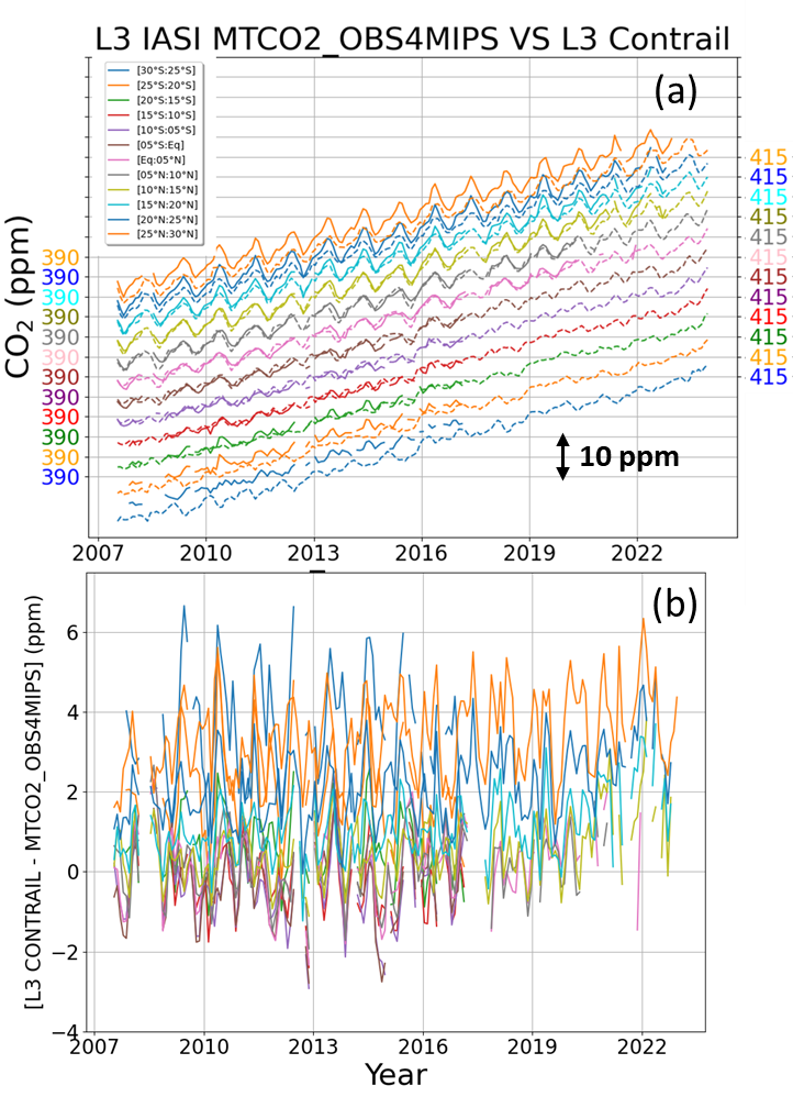 Figure 4: (a) Monthly mean of L3 IASI MT-CO2 Obs4MIPs v10.1 (dashed line) from July 2007 to November 2022 and of L3 CONTRAIL CO2 (full line) in 12 latitudinal bands of 5° each from 30°S to 30°N; (b) the associated differences between MT-CO2 Obs4MIPs v10.1 and L3 CONTRAIL CO2.