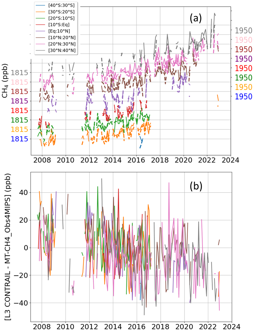 Figure 7: (a) Comparison between CONTRAIL and L3 MT-CH4 over July 2007-November 2022. Monthly evolution of L3 CONTRAIL CH4 (dashed line) and IASI L3 MT-CH4 (full line) for 8 latitudinal bands of 10° each. Each series is shifted by 30 ppb (black arrow) to be displayed on the same figure. (b) the associated differences between MT-CH4 Obs4MIPs v10.2 and L3 CONTRAIL CH4.