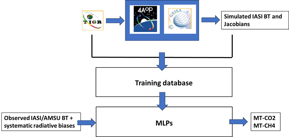The training database from which the networks learn the relationship existing between inputs and outputs is based on the TIGR database. For all TIGR atmospheric situations, for all scan angles, and for the whole IASI channels used in the retrieval process, clear-sky brightness temperatures, transmittances and Jacobians have been computed using the 4A/OP radiative transfer model with the spectroscopic database GEISA-2011 (Jacquinet-Husson et al. 2011) as input. The required AMSU-A BTs are computed using the STRANSAC microwave forward model (Scott, 1974). Network input BTs correspond to randomly drawn values of concentration in the range 1610-2110 ppb for CH4 and in the range 345-445 ppm for CO2, centred on the TIGR reference value of 1860 ppb for CH4 and 395 ppm for CO2;. It is worth noting that no prior information is thus given to the networks in terms of seasonality, trend, or geographical patterns of the gases.