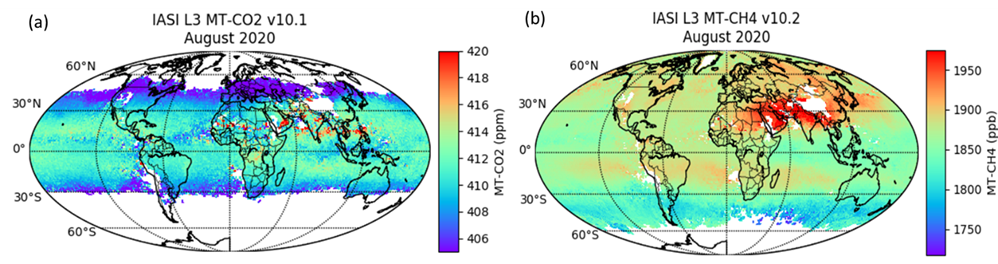 Figure 6: Examples of maps of MTCO2_OBS4MIPS (a) and MTCH4_OBS4MIPS (b) for August 2020