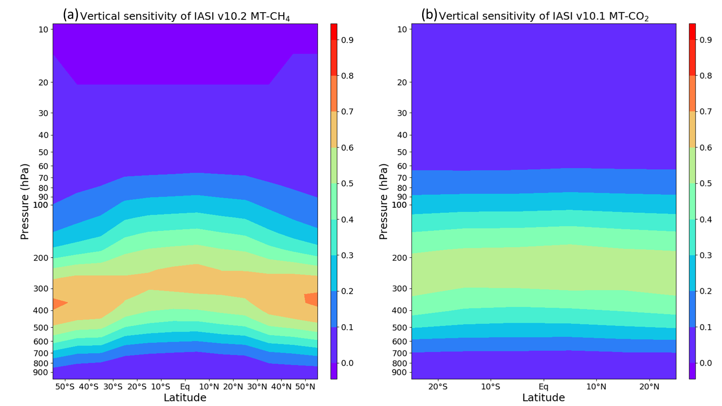 Figure 5: Vertical sensitivity of IASI v10.2 MT-CH4 retrievals (a) and v10.1 MT-CO2 retrievals (b) as a function of latitude.