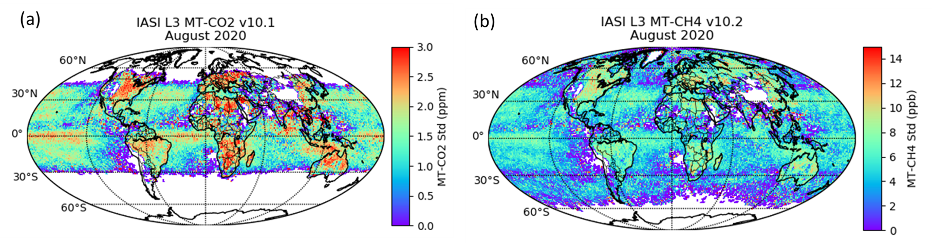 Figure 7: Examples of maps of MTCO2_OBS4MIPS (a) and MTCH4_OBS4MIPS (b) standard deviations for August 2020
