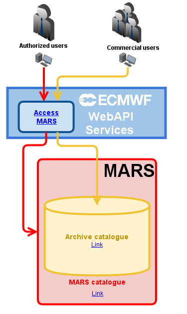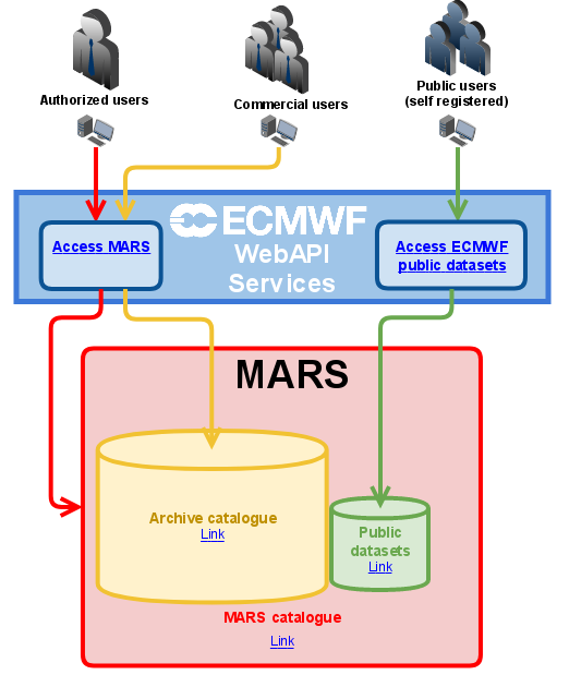 This external access is limited and managed by the User Profile access (Member State, Commercial customers, ECMWF staff member...). Some of these services are public and some other are restricted to the Archive Access.