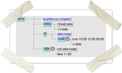 An acquisition task may be needed to initiate the processing. The following example shows such a pattern where a wait task is created to check the presence of input data in the acquisition time window 10:00 to 12:00. A task is dedicated to raise a red alarm, by 11:00, if data are not yet arrived, to have operators and analysts aware in advance and careful about this. wait task runs every 5 minutes and set the data event when input data are found ; it shall sleep 60 seconds, after setting the event, before completing, to ensure the server receives the event and starts the data task, before wait task completion and immediate requeue (cron). data task (validation and preprocessing) will then set the ready event and acq family will become complete, provided underneath tasks are complete or queued, so that rt/wait and late_alert do not run any further.