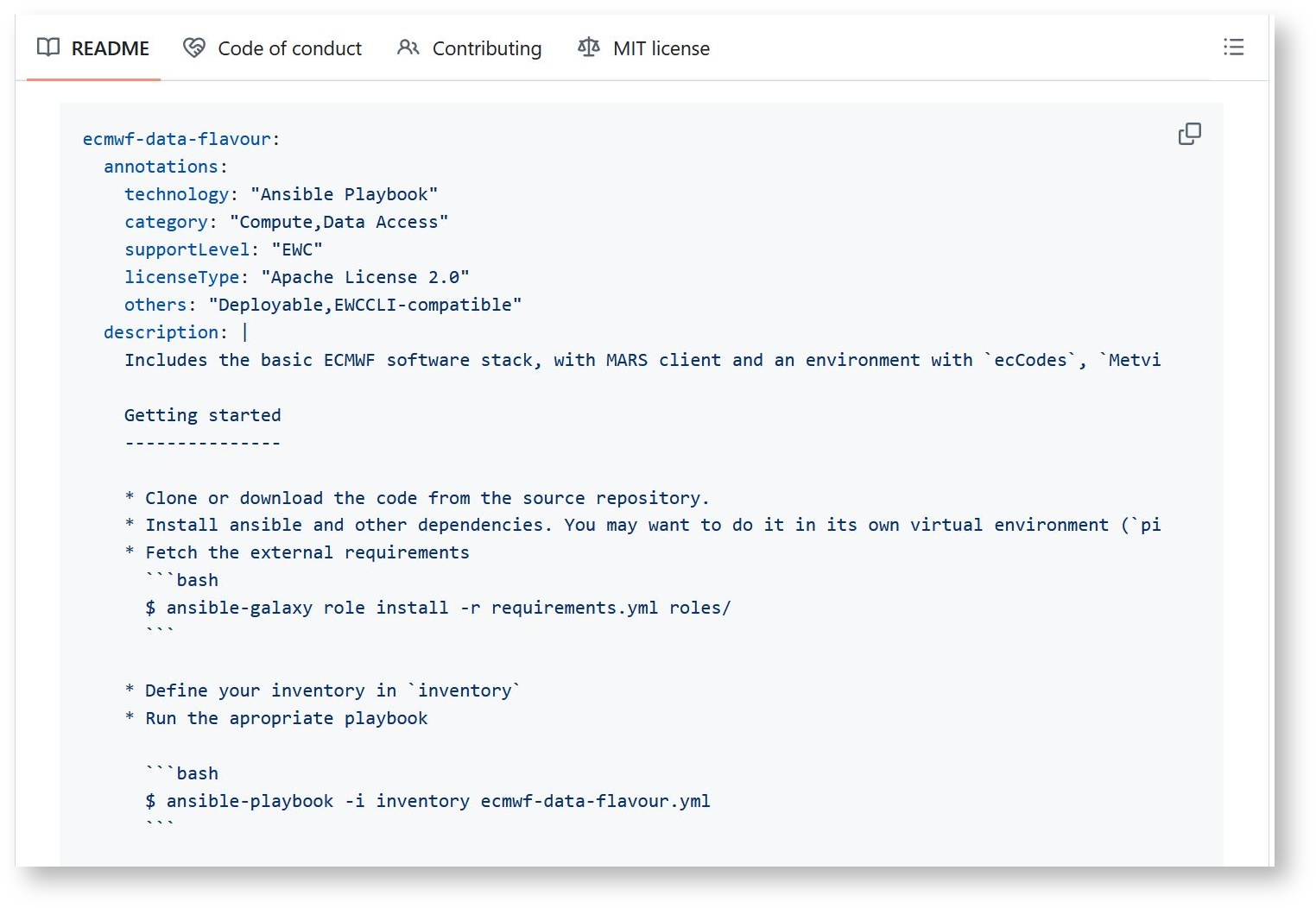 To help both contributor and reviewers to categorize this information, we kindly ask you to fit in your Item details into the Item Metadata structured used by the EWC Community Hub (YAML format). Take as example metadata of the "ECMWF Data Flavour" Item, published on GitHub. When preparing metadata for your own Item, we recommend you copy the content of said example YAML and adapt values accordingly.